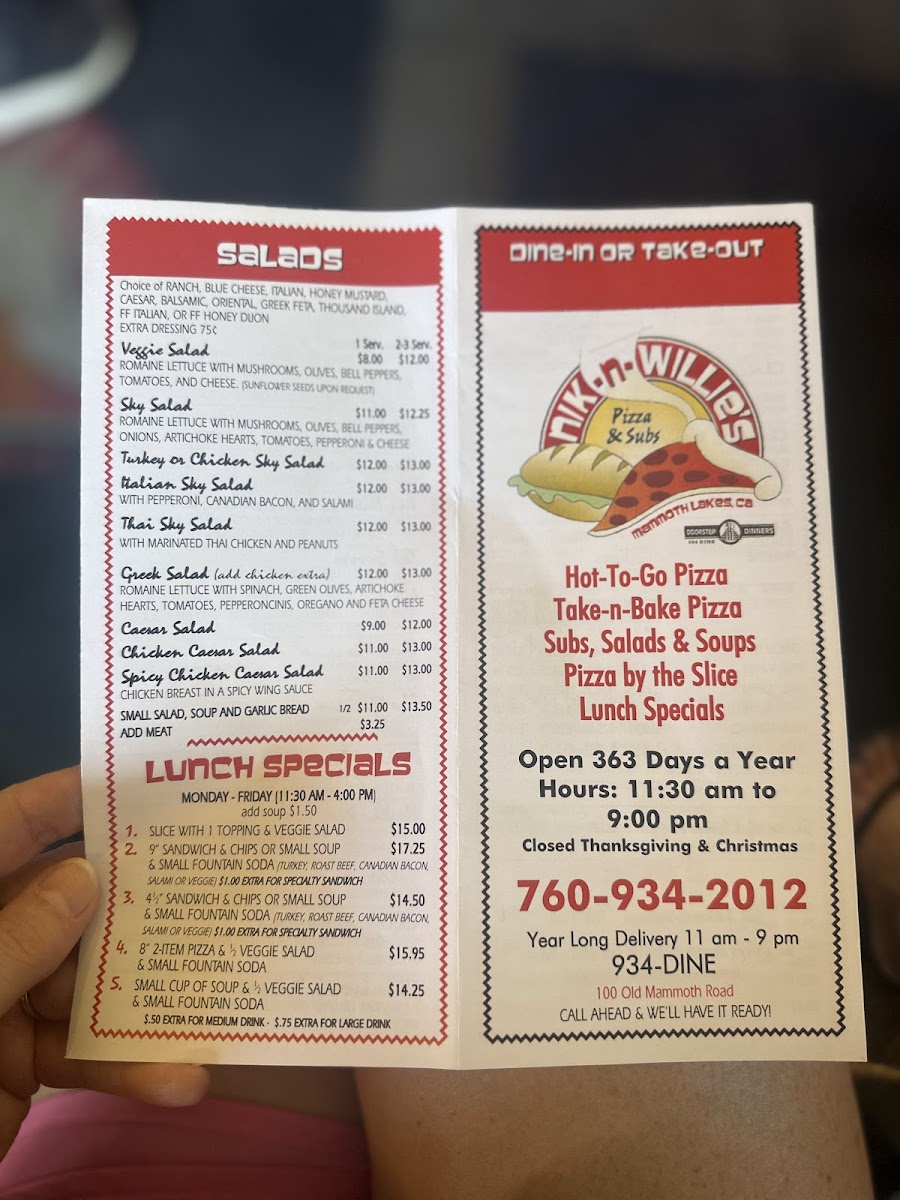Nik-N-Willie's Pizza-n-Subs, nestled in the heart of Mammoth Lakes, has made quite a name for itself, delivering a menu that reflects both quality and taste. Renowned for its spectacular pizzas, customers rave about the fresh ingredients and perfectly crunchy crusts. From the savory "The Veggie" to a variety of meat options, each bite is crafted to perfection. Plus, the generous portions ensure you won’t leave hungry!